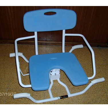 Cadeira de banho giratória, para apoio nas laterais da banheira, permitindo que o utente se sente com os pés de fora da banheira e seja depois ajudado para rodar para dentro dela. Tamanho universal