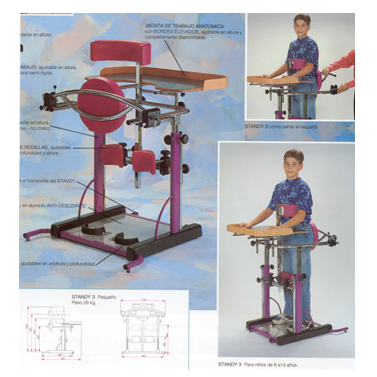Dispositivo que permite verticalizar o doente por periodos prolongados, dispondo de uma mesa para alimentação ou actividades variadas. Marca e modelo: ORMESA- STANDY